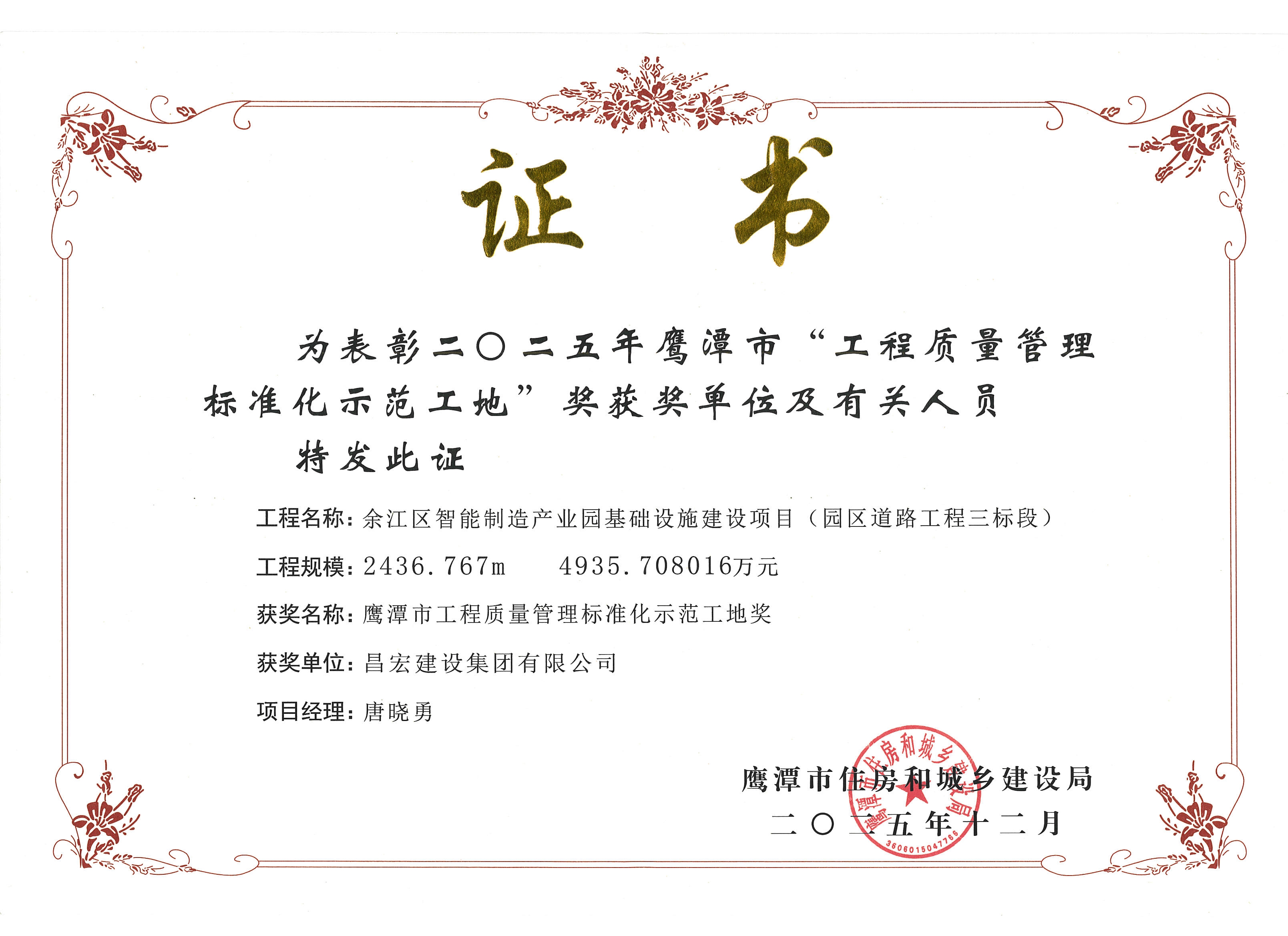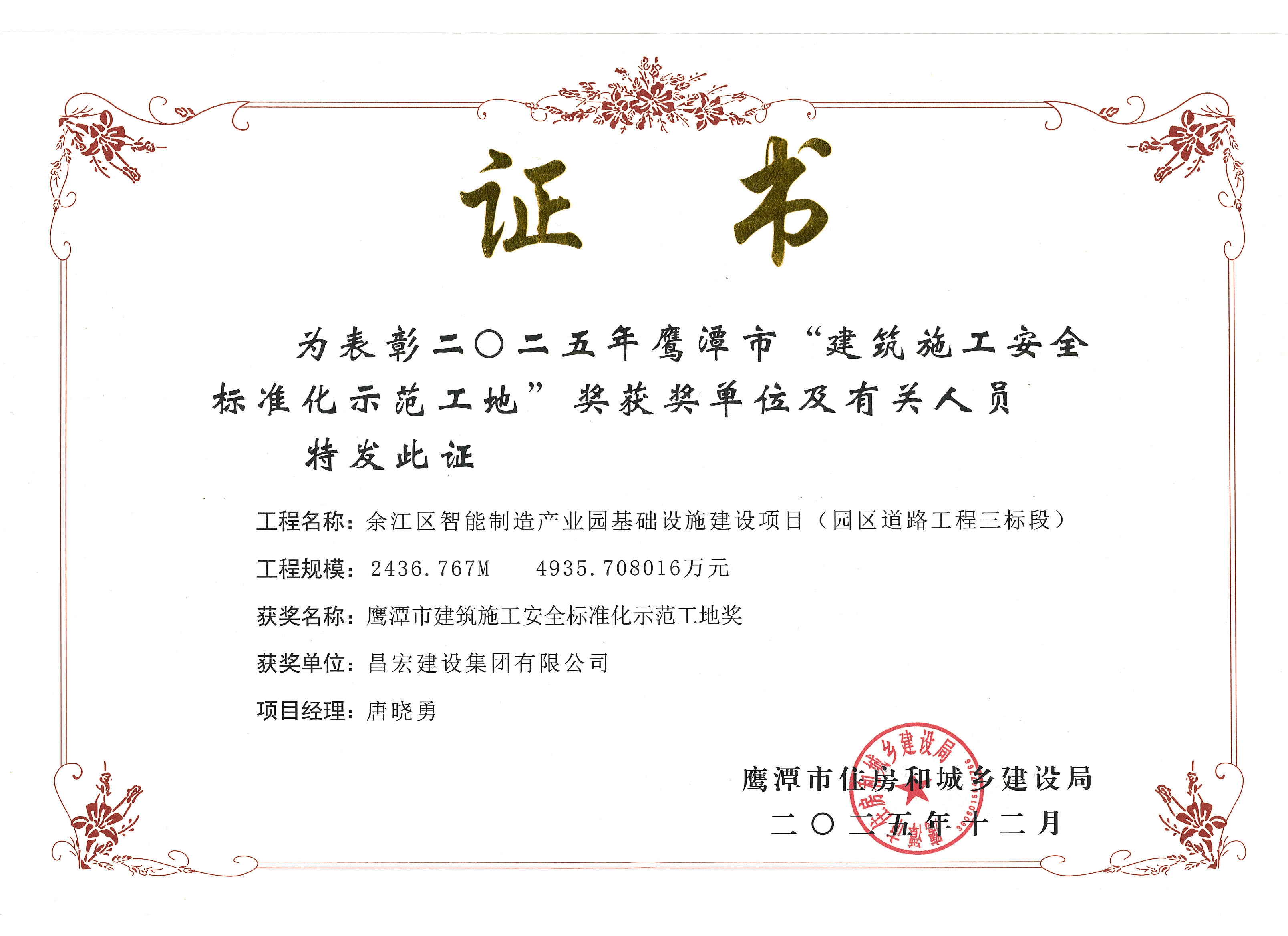 昌宏建设集团荣获二o二五年鹰潭市“工程质量管理标准化示范工地及二0二五年鹰潭市“建筑施工安全标准化示范工地称号 -ag娱乐平台官方网站